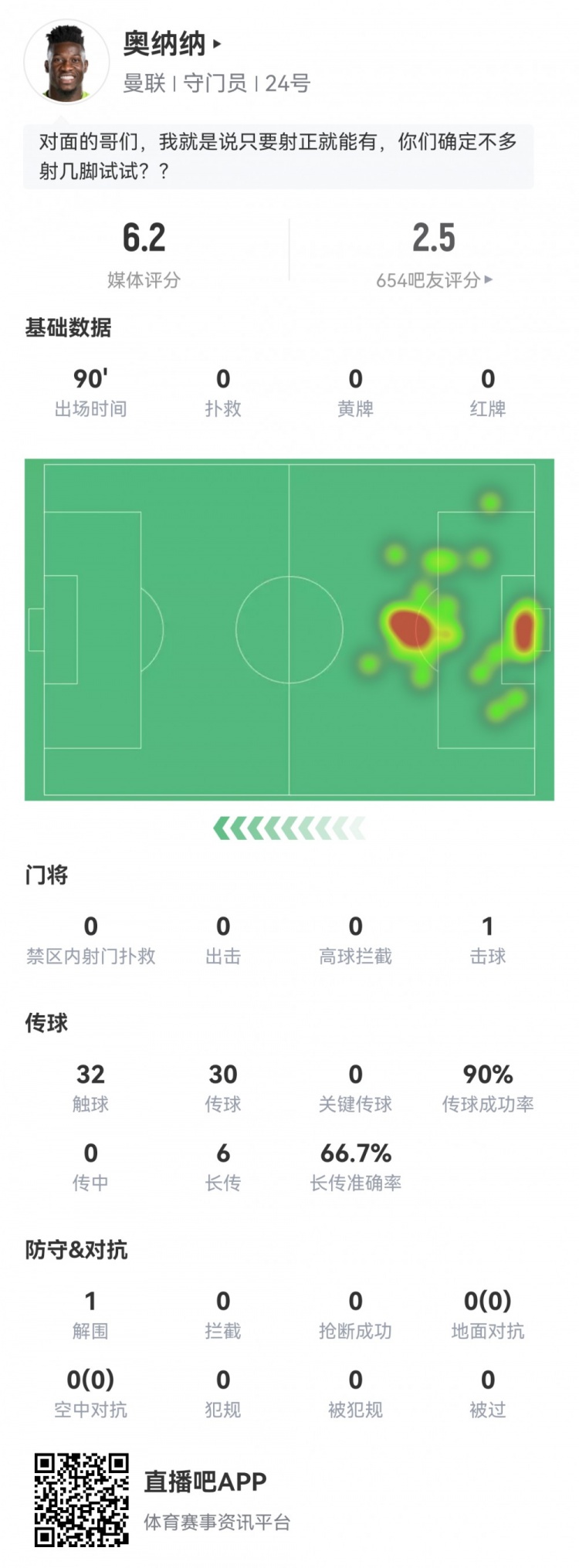 一言难尽!奥纳纳本场数据:全场0扑救,获评全场并列最低6.2分