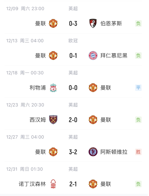 12月31日讯 本轮英超,曼联1-2不敌诺丁汉森林。此役过后,曼联在各赛事最近6场只拿到一胜,即上轮击败维拉的比赛。只看联赛的话,曼联最近5轮1胜1平3负,只拿到4分