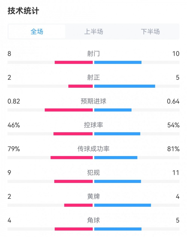 森林2-1曼联数据对比:射门8-10射正2-5,预期进球0.82-0.64