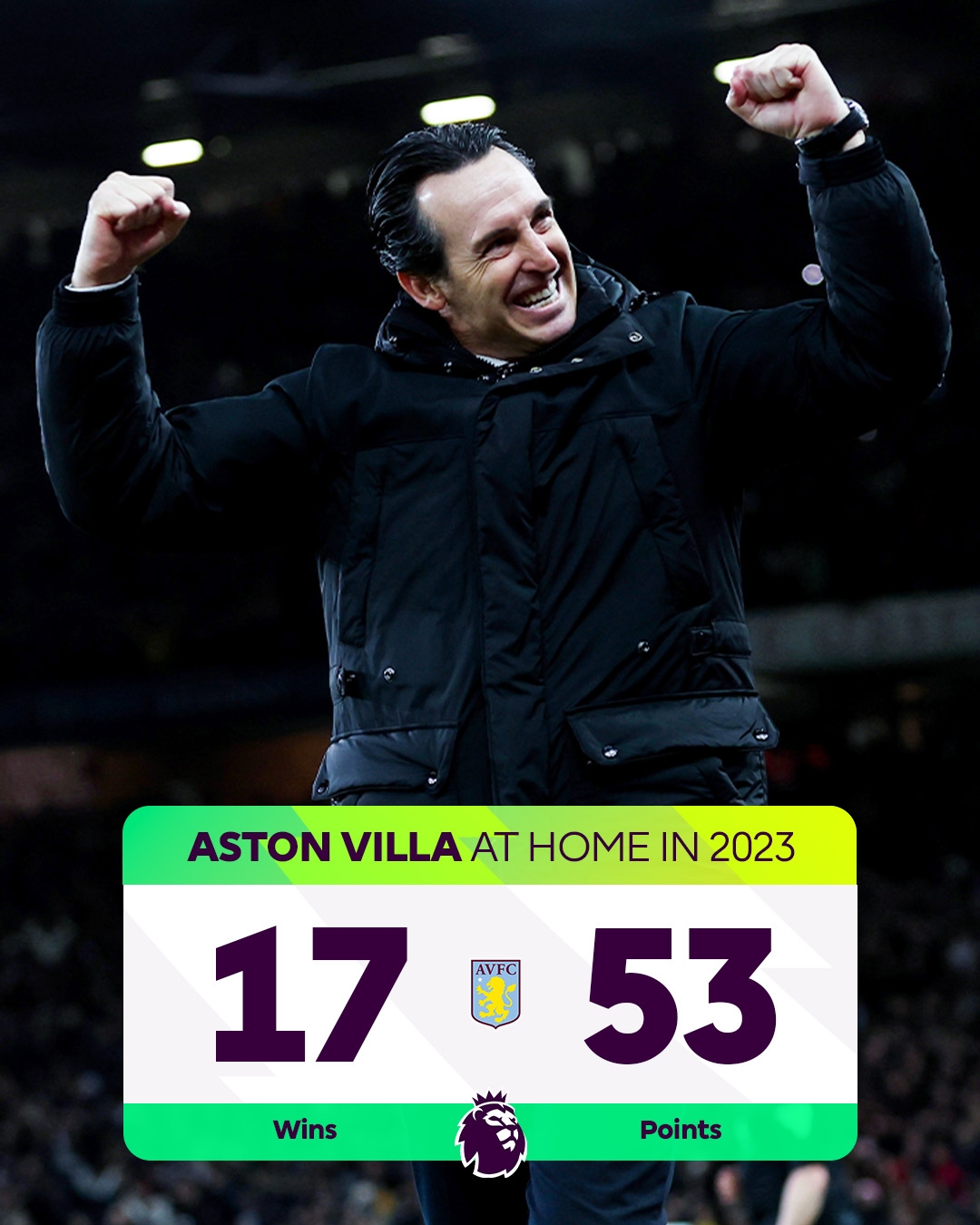 12月31日讯 天空体育统计了2023年英超主场积分榜,维拉53分排名第一。