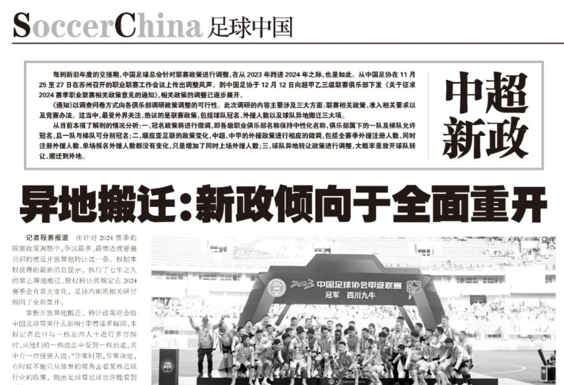 根据《足球报》获得的最新消息显示,执行了七年之久的禁止异地搬迁、股权转让的规定在2024赛季会有重大变化,足协内部的相关研讨倾向于全面重开。