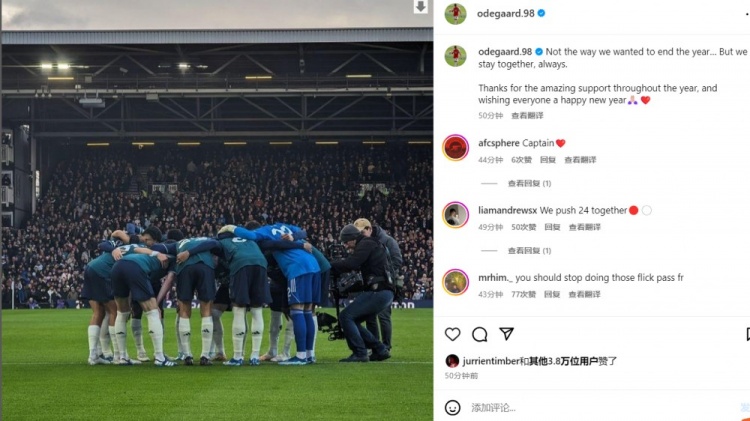 1月1日讯 英超第20轮,阿森纳客场1-2不敌富勒姆,遭遇英超2连败。枪手队长厄德高更新了个人社媒。