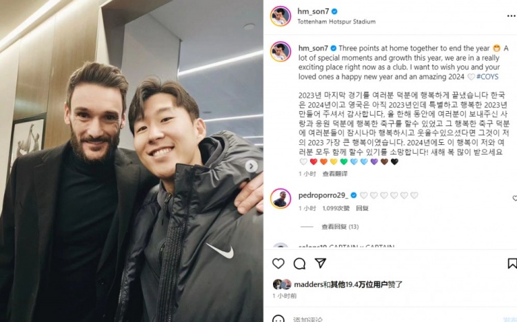 1月1日讯 英超第20轮,孙兴慜破门,热刺3-1战胜伯恩茅斯。孙兴慜更新了自己的Instagram动态。