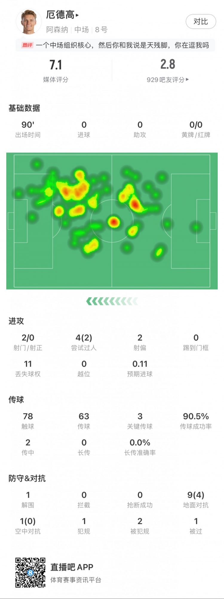 厄德高本场数据:3次关键传球,2次射门0次射正,2次过人
