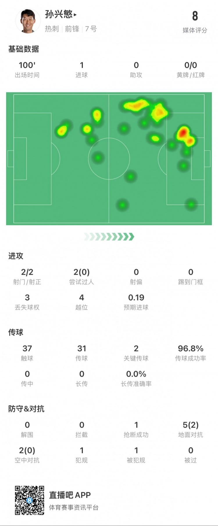 孙兴慜全场数据:1粒进球,传球成功率97%,4次越位