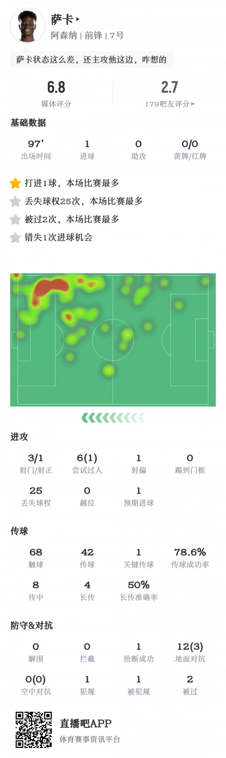 萨卡数据:3射1进球,25次失球权全场最多,传中8中0,获评6.8分