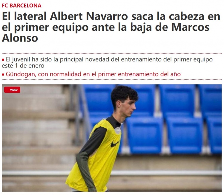 1月2日讯 《世界体育报》报道,由于马科斯-阿隆索受伤,巴萨已经将小将阿尔伯特-纳瓦罗召入一线队训练。