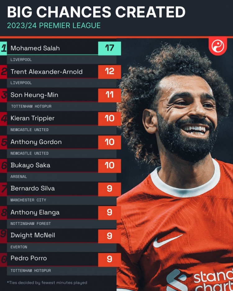 英超创造重大机会榜:萨拉赫17次居首,阿诺德、孙兴慜前三