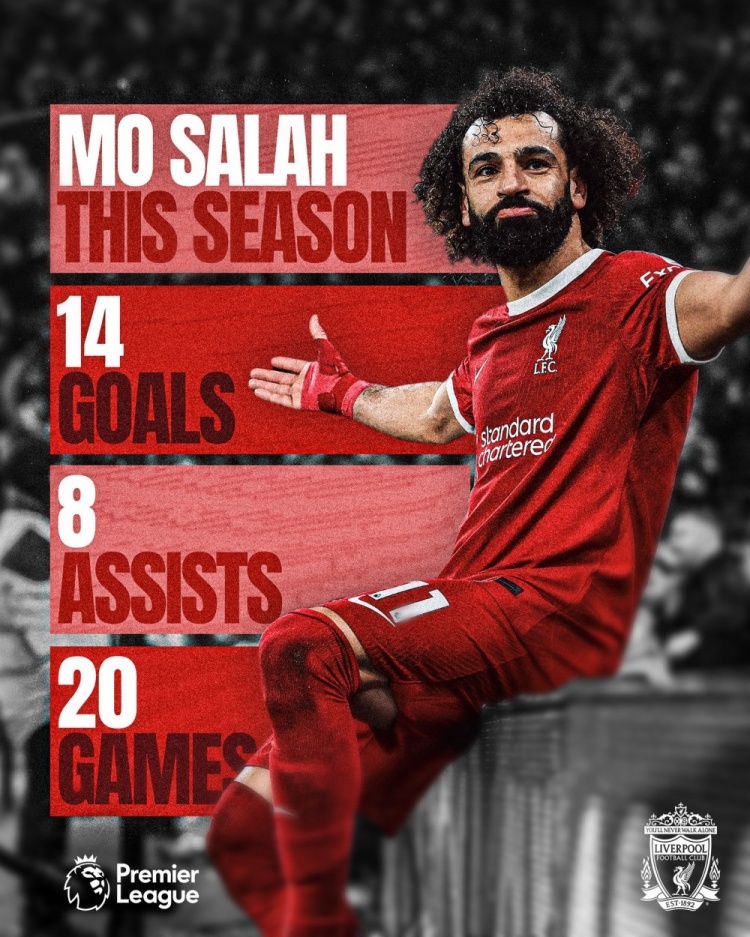 20场14球8助!利物浦晒萨拉赫本赛季英超数据:杰出!