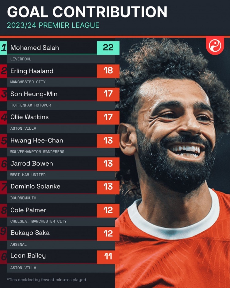 本赛季英超参与进球榜:萨拉赫22球居首,哈兰德、孙兴慜二三位