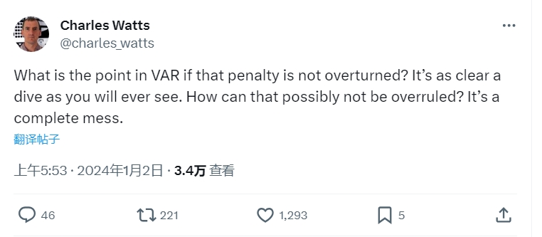 Charles Watts:“这球看了VAR还不推翻,那VAR还有什么意义?这是你能看到的最明显的跳水了,怎么可能不推翻判罚?真是一团糟。”