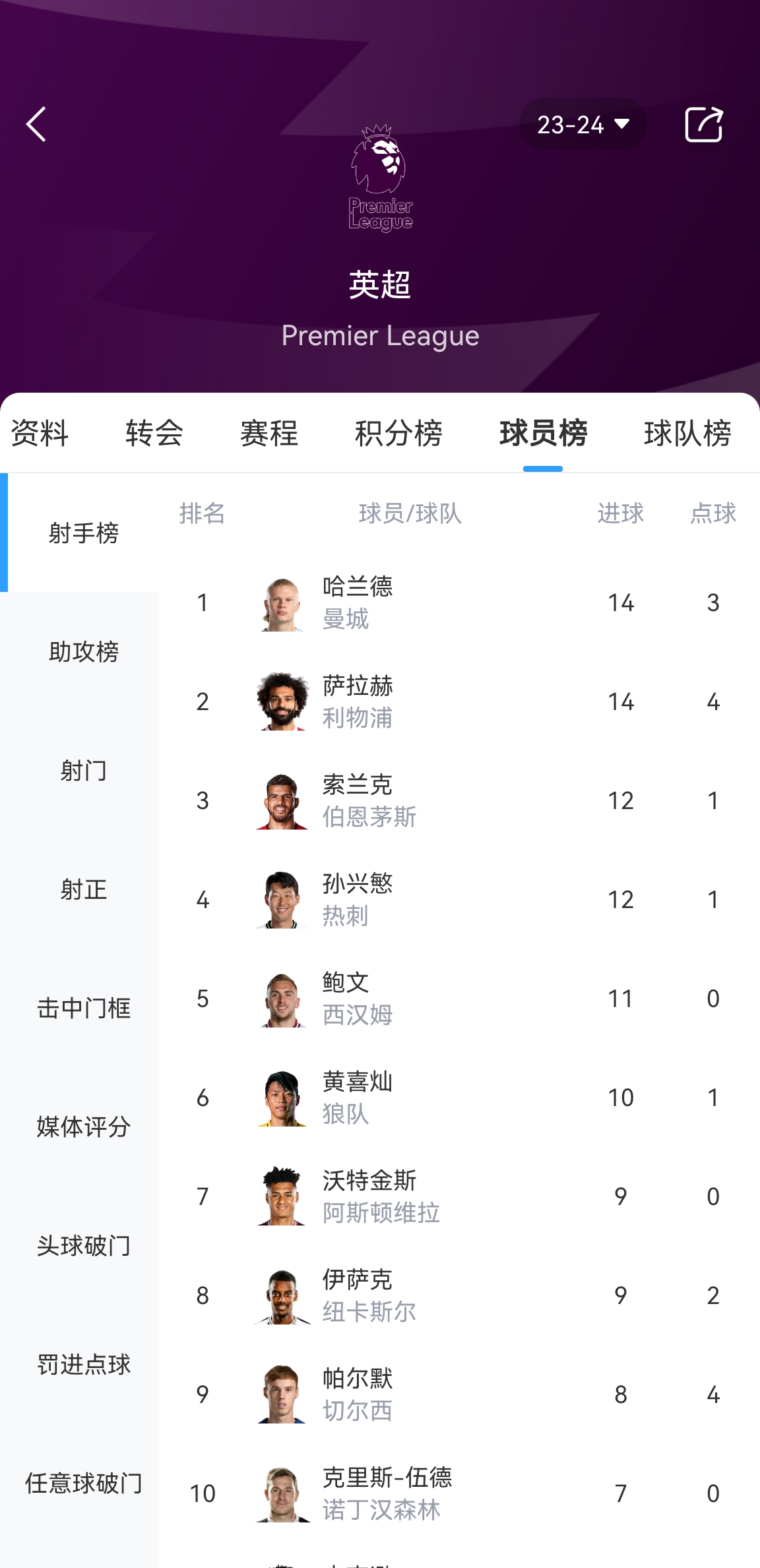 萨拉赫14球与哈兰德并列射手榜第一↓