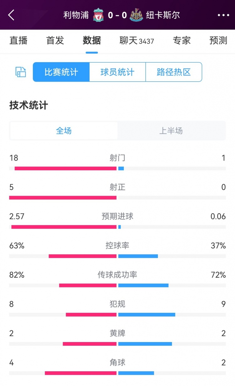利物浦vs纽卡半场数据:射门18-1 红军预期进球2.57仍颗粒无收