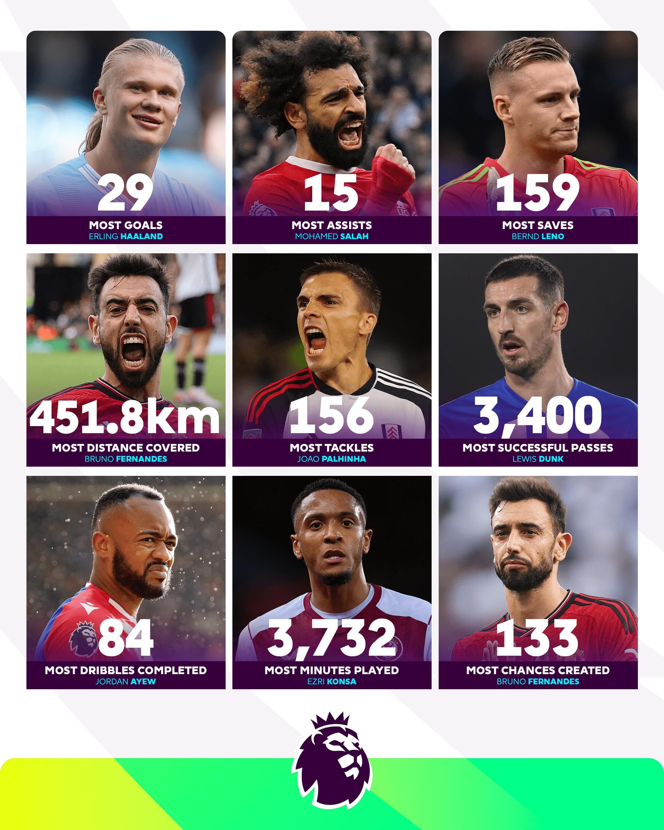 其中,哈兰德、萨拉赫分别是进球、助攻最多的球员,哈兰德打入29球,萨拉赫贡献15次助攻。B费的跑动距离、创造机会数分别为451.8千米、133次,在这两项数据上排名第一。
