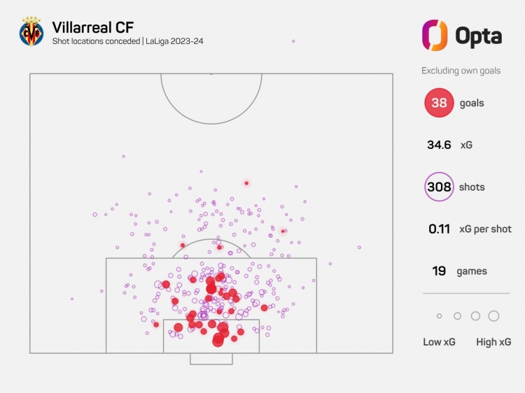 据Opta统计,比利亚雷亚尔本赛季前19轮西甲比赛丢掉38球,创造本队同期最差纪录,只比上赛季整个赛季少2球。