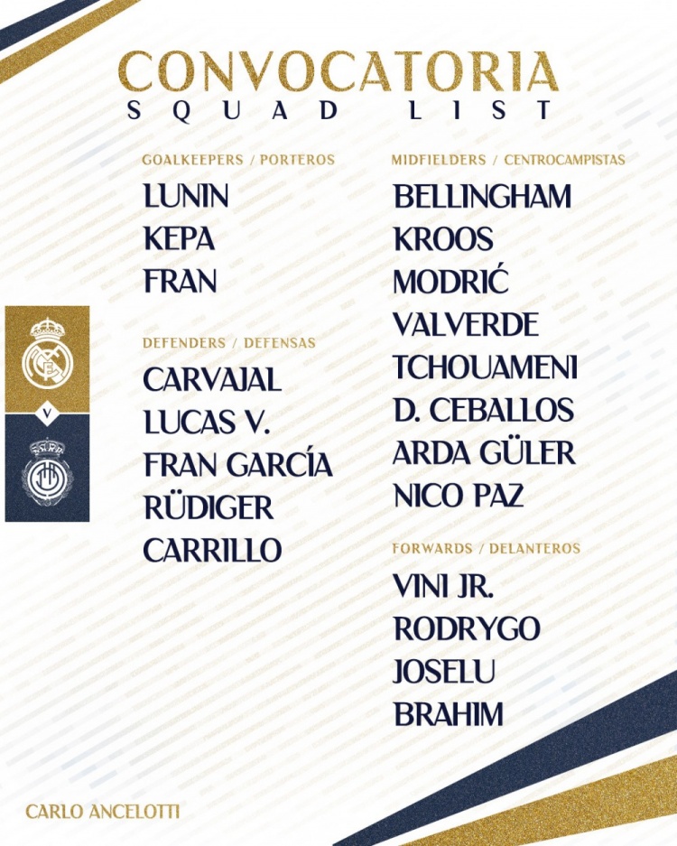 赛前官方公布的大名单,维尼修斯、居勒尔、卡瓦哈尔回归↓