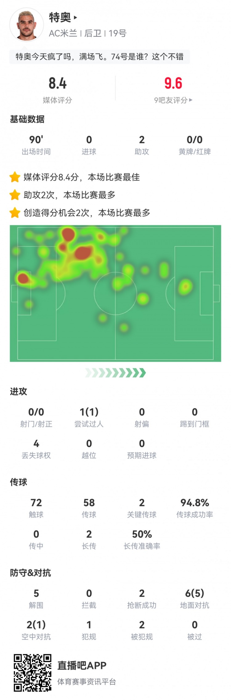 1月3日讯 意杯1/8决赛,米兰4-1卡利亚里晋级八强。此役特奥发挥出色助攻双响,球员重点数据如下↓