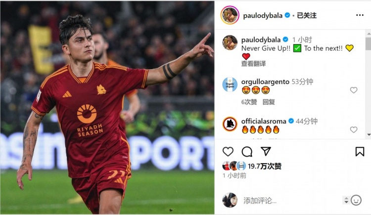 点射绝杀!迪巴拉社媒庆祝胜利:永不放弃,晋级下一轮!