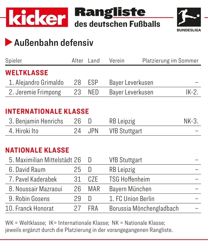 1月4日讯 德国媒体《踢球者》对德甲边卫球员上半赛季的表现进行评级,格里马尔多、弗林蓬世界级。踢球者德甲上半程边卫评级世界级格里马尔多(勒沃库森)、弗林