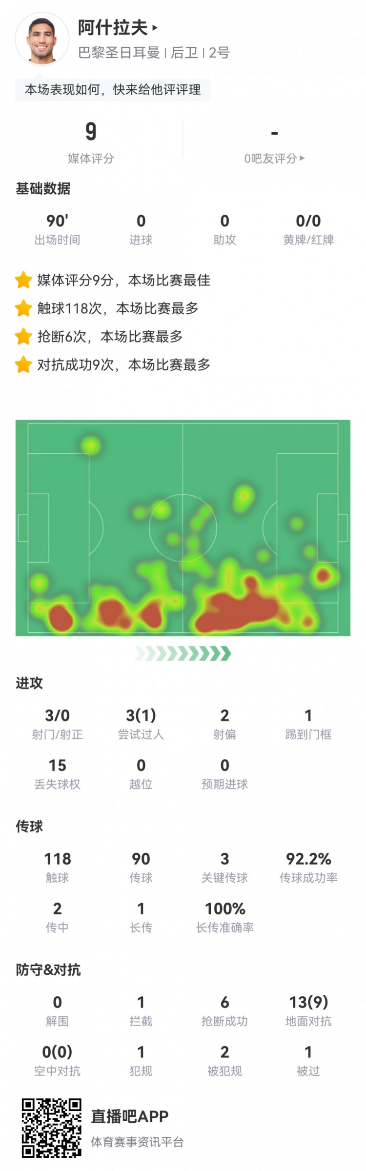制霸右路!阿什拉夫本场数据:3次关键传球1中框,全场最高9.0分