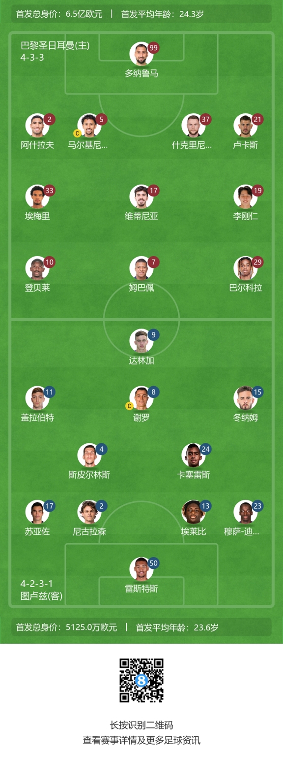 巴黎首发:99-多纳鲁马、2-阿什拉夫、5-马尔基尼奥斯、37-什克里尼亚尔、21-卢卡斯-埃尔南德斯、33-埃梅里、17-维蒂尼亚、19-李刚仁、10-登贝莱、7-姆巴佩、29-巴尔科拉