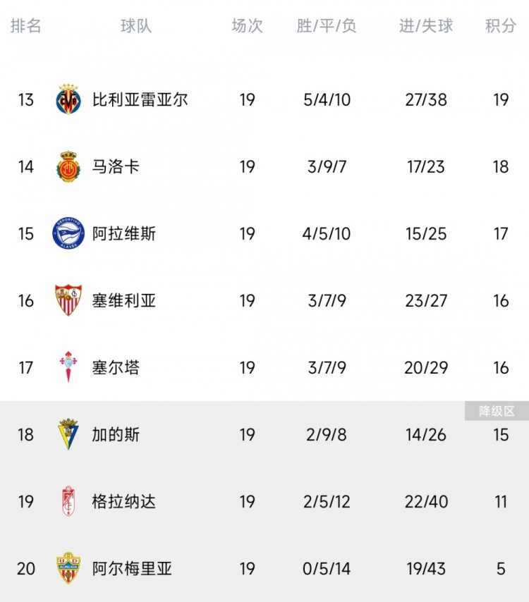 塞维利亚赛季前19轮仅取胜3场,追平队史最差纪录,此前曾3次出现这样的情况,近2次塞维利亚皆降级。