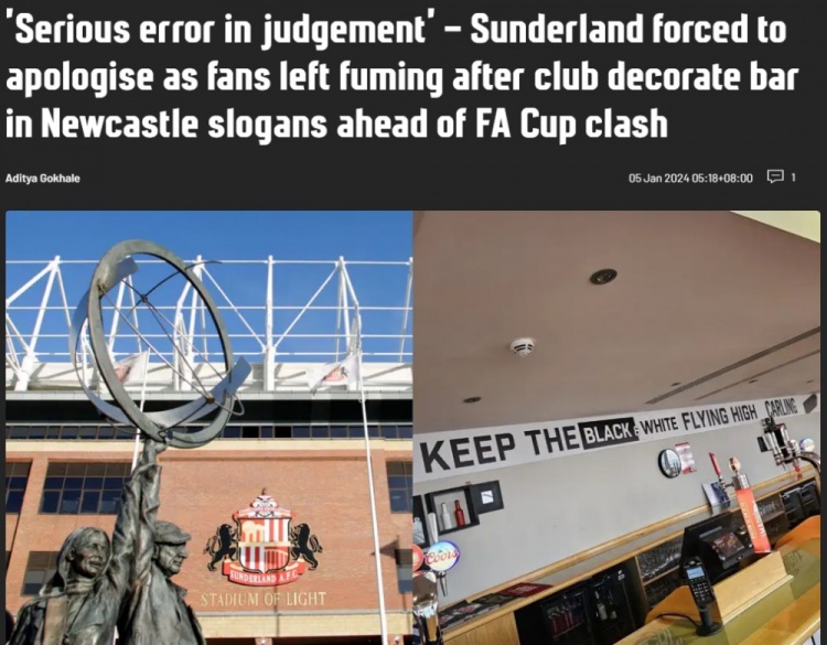 1月5日讯 进球网报道,桑德兰因为给主场里的酒吧装饰上死敌纽卡斯尔的标语,被自家球迷喷到发文道歉。