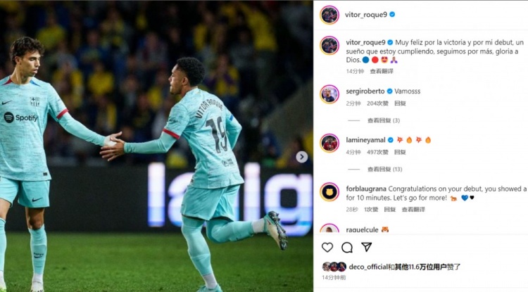 1月5日讯 西甲第19轮,巴萨2-1逆转战胜拉斯帕尔马斯。本场比赛,罗克替补登场,完成巴萨首秀。罗克更新社媒表示道:“为胜利和我的处子秀感到非常高兴,我实现了一
