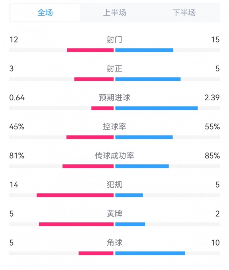 1月5日讯 本轮西甲巴萨2-1绝杀拉斯帕尔马斯,双方数据对比如下(拉斯帕尔马斯在前)↓射门12-15射正3-5预期进球0.64-2.39控球率45%-55%传球成功率81%-85%犯规14