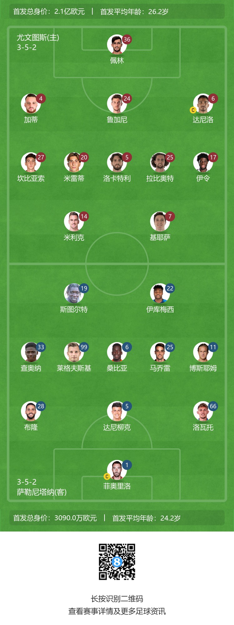 尤文首发:36-佩林、4-加蒂、24-鲁加尼、6-达尼洛、27-坎比亚索、20-米雷蒂、5-洛卡特利、25-拉比奥特、17-伊令、14-米利克、7-基耶萨