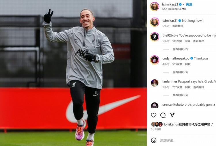 1月6日讯 利物浦左后卫齐米卡斯更新社媒,晒出训练照,表示道:现在没多久了!