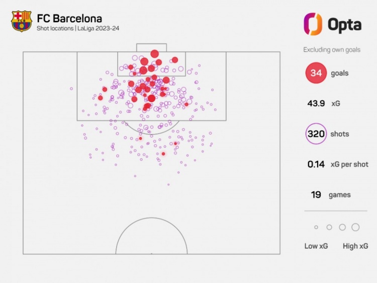 巴萨本赛季西甲至今320次射门,每次射门预期进球0.14,预期进球43.9,打进了34粒进球(不计算2粒乌龙球)。