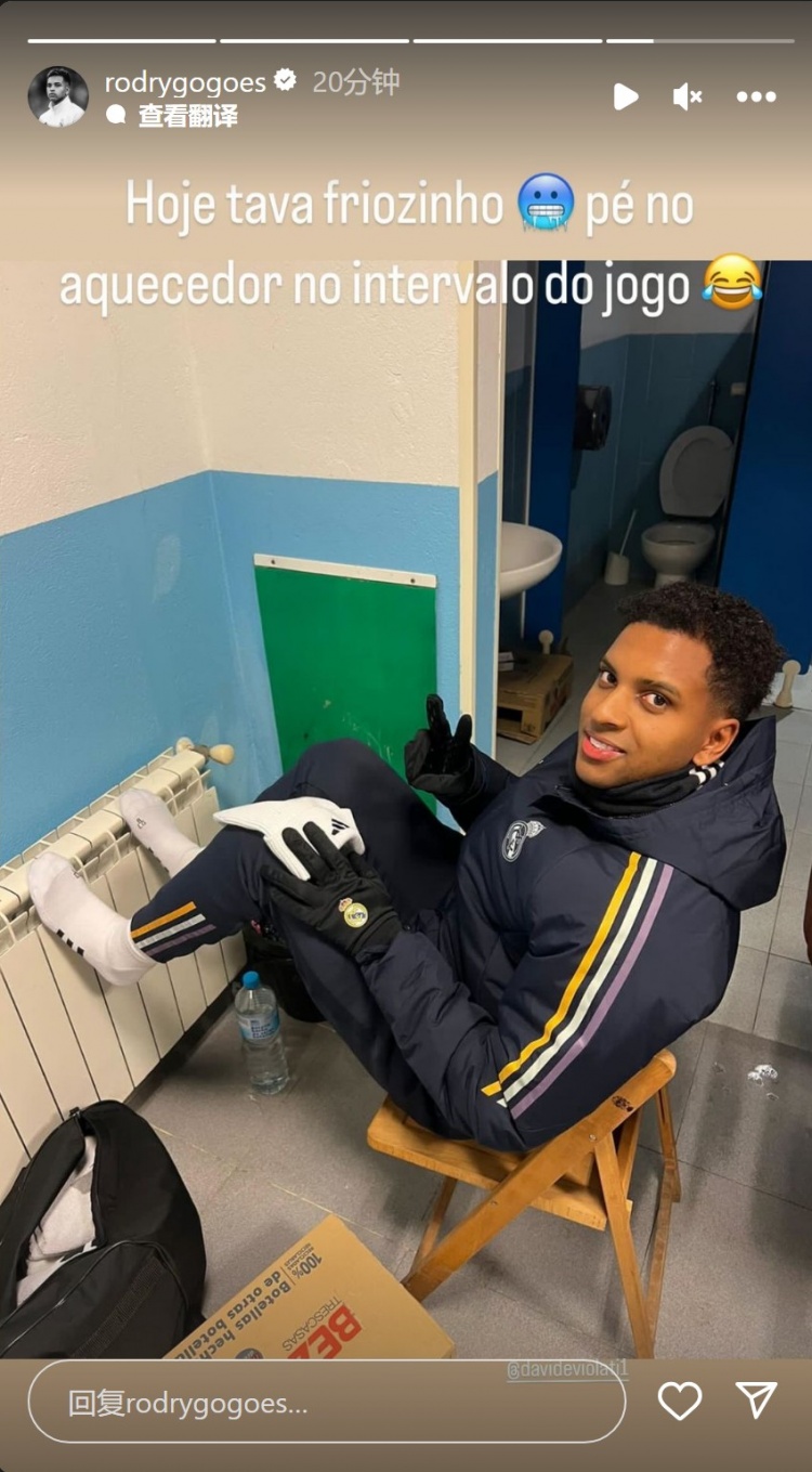 罗德里戈在社交媒体上晒出中场休息时用暖气烤脚的照片,并配文:“今天很冷,我在中场休息时开了暖气。”