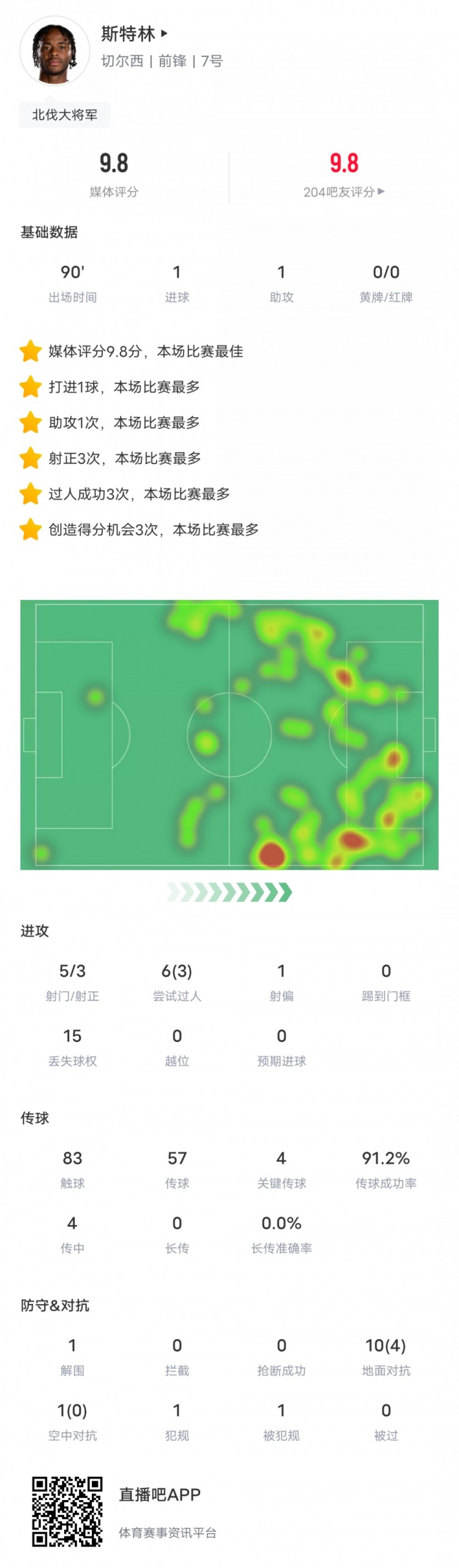 斯特林本场数据:传射建功,4次关键传球,评分9.8全场最高