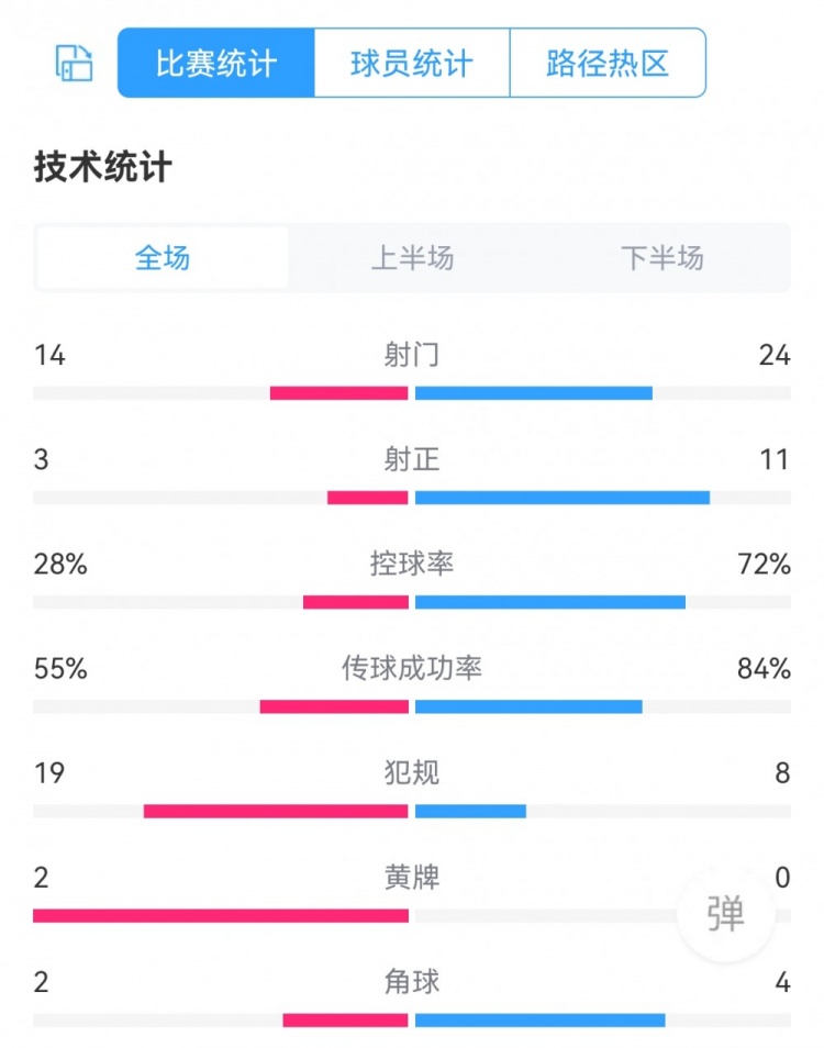 下半场巴巴斯托攻势渐起,半场共射门13次,全场射门比为24-14。
