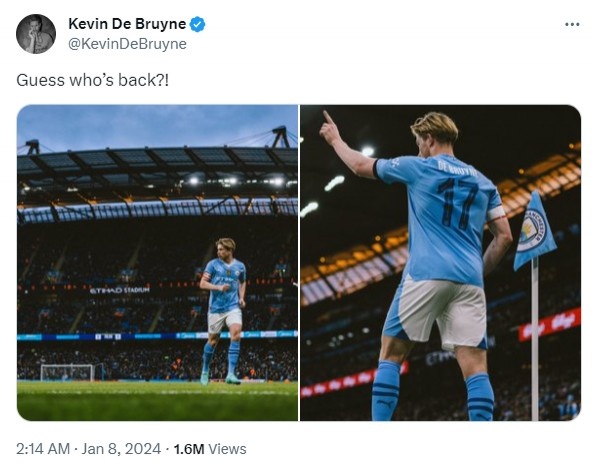 赛后,德布劳内更新社媒晒照表示道:猜猜谁回归了?!
