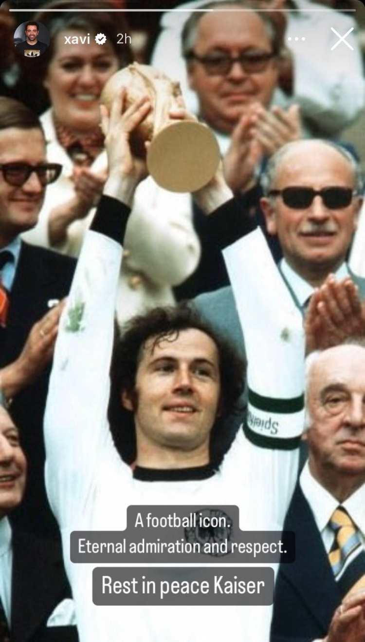 巴萨主帅哈维更新社媒悼念道:“一位足坛偶像,永远值得钦佩和尊敬,安息吧,贝皇。”