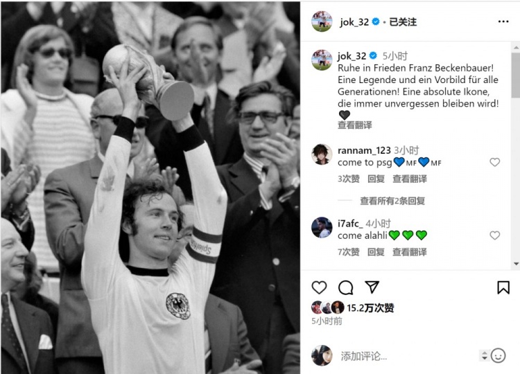 1月9日讯 德国传奇球星贝肯鲍尔去世,享年78岁,拜仁中场基米希社媒发文表示哀悼。