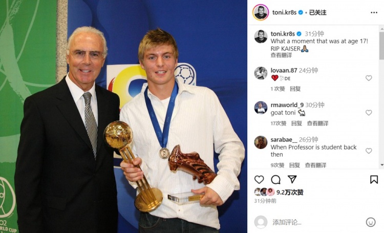 克罗斯晒17岁时与贝肯鲍尔的合照悼念传奇:安息吧凯撒