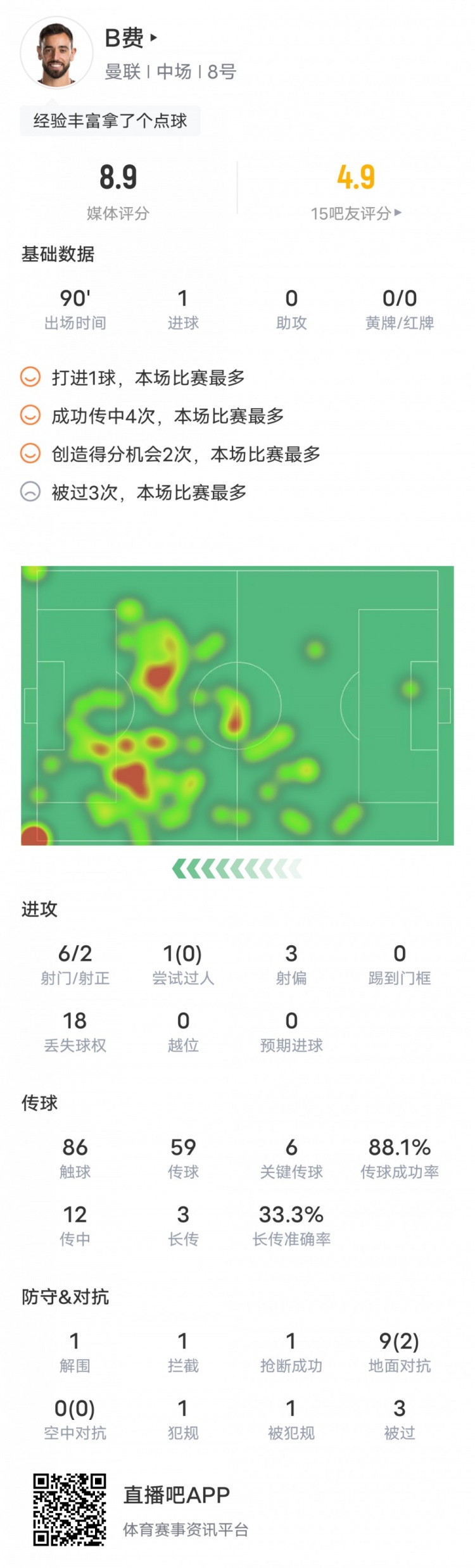 1月9日讯 在今日凌晨进行的一场足总杯比赛中,曼联2-0维冈竞技,晋级下一轮。本场比赛,曼联中场B费首发,打进1粒点球,还有6次关键传球,评分8.9。