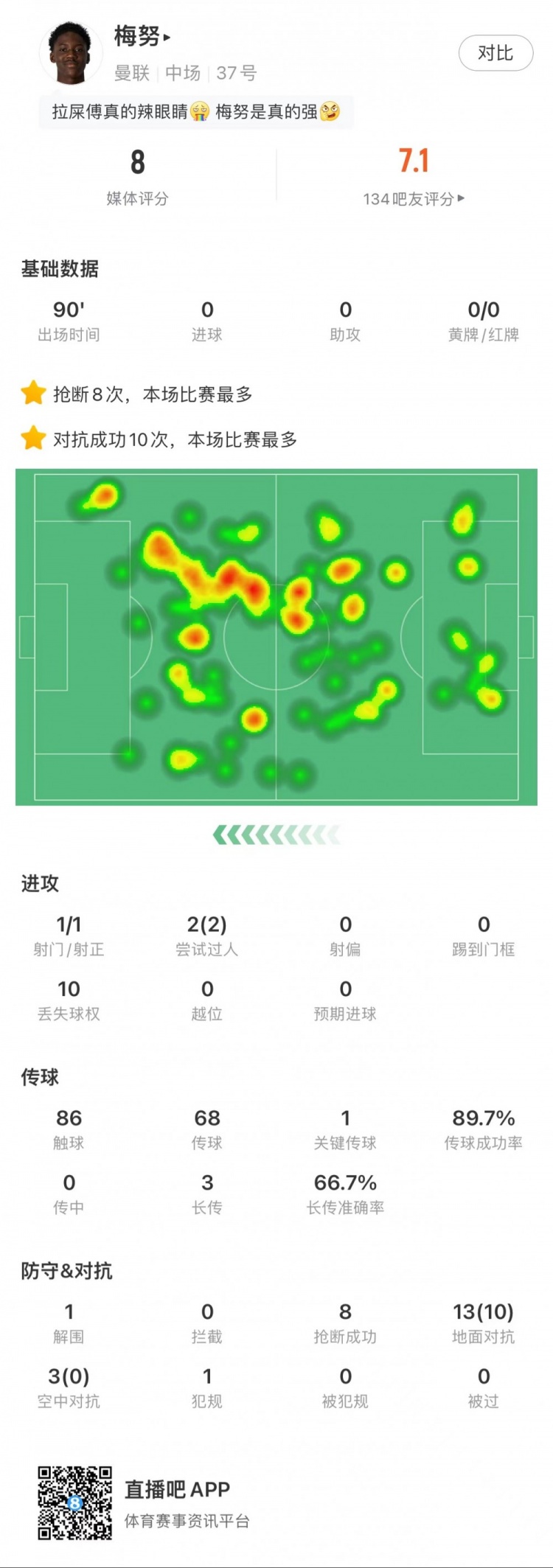 梅努全场数据:10次赢得地面对抗,8次成功抢断,2次成功过人