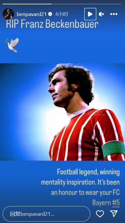 国米后卫帕瓦尔悼念道:安息吧贝肯鲍尔,你是一位足坛传奇,启迪人以胜利的心态。能够身穿你的拜仁5号球衣是一种荣幸。
