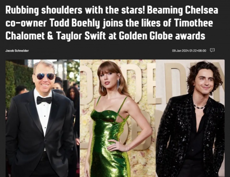 1月9日讯 第81届美国电影电视金球奖于当地时间7日晚在洛杉矶举行颁奖礼,切尔西俱乐部老板之一伯利也参加了这场典礼。伯利一袭礼服+墨镜亮相,与在斯坦福桥出