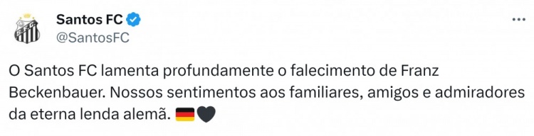 桑托斯写道:桑托斯足球俱乐部为贝肯鲍尔的逝世深感遗憾。我们对这位永恒的德国传奇的家人,朋友和崇拜者的致意。