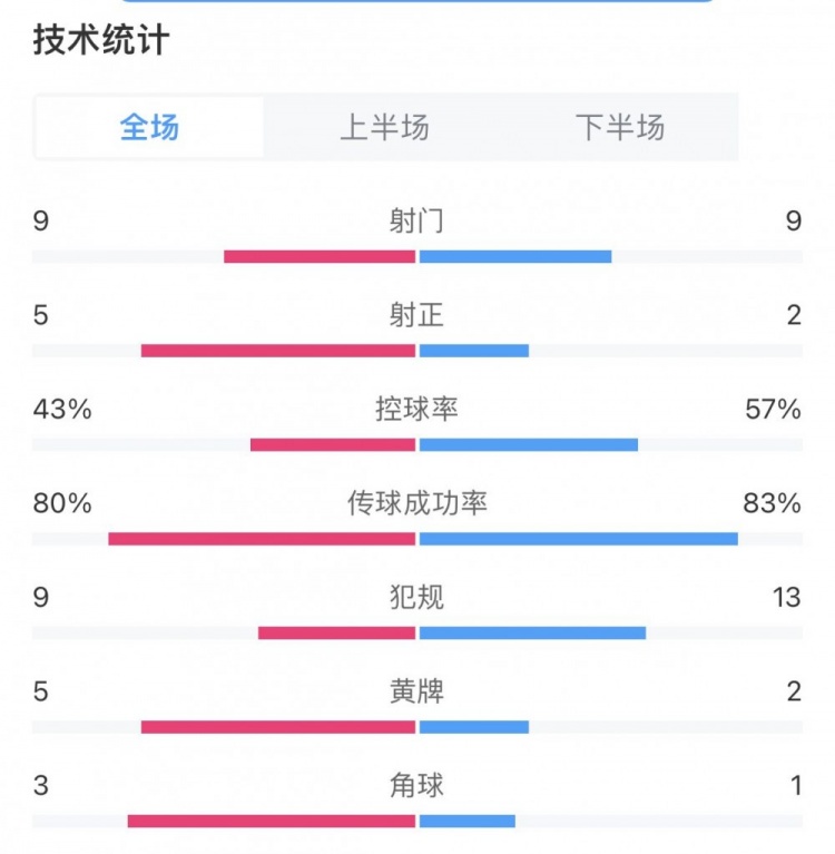1月11日讯 意大利杯1/4决赛,罗马客场0-1不敌拉齐奥。本场比赛双方全场数据对比如下(拉齐奥在前):射门:9-9射正:5-2控球率:43%-57%传球成功率:80%-83%犯规次数:9-13