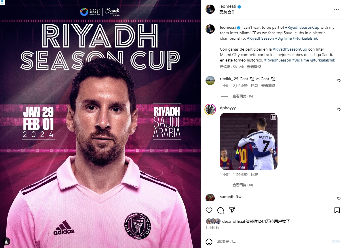 梅西在INS中写道:“我迫不及待地想和我的球队迈阿密国际一起参加利雅得赛季杯,因为我们将在这场历史性的比赛中与沙特顶级球队交手。”