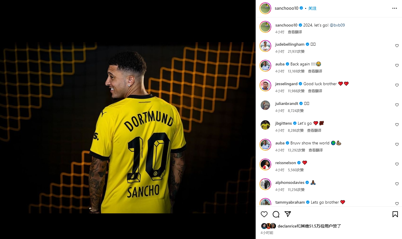 回到多特的桑乔将自己的ins账号ID改为“sanchooo10”,并发布动态:“2024,let's go!@多特”。