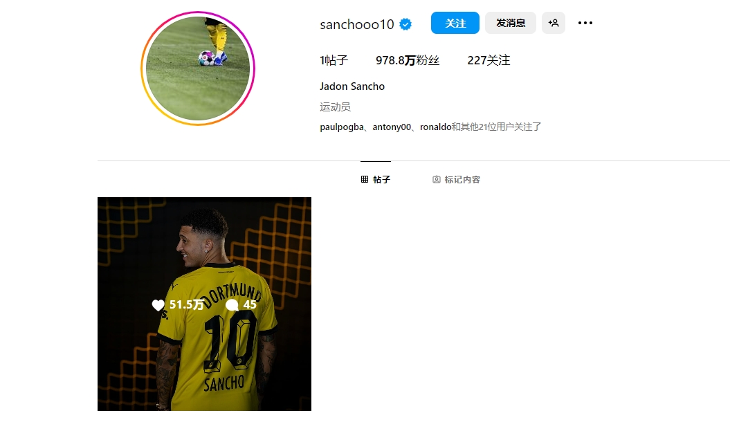 新的开始!桑乔社媒ID改为“sanchooo10”发动态,安东尼、姆总点赞