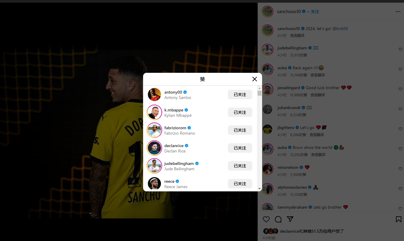 桑乔在曼联的队友安东尼,以及姆巴佩、罗马诺、赖斯、贝林厄姆、里斯-詹姆斯等人目前都为这条动态点了赞。