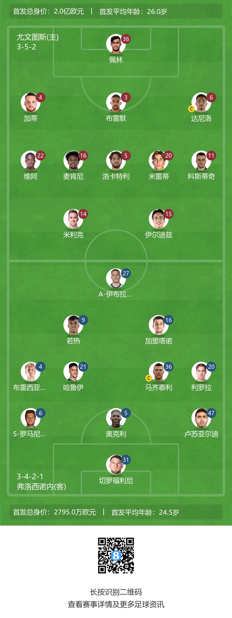 尤文首发:36-佩林、4-加蒂、3-布雷默、6-达尼洛、22-小维阿、16-麦肯尼、5-洛卡特利、20-米雷蒂、11-科斯蒂奇、15-伊尔迪兹、14-米利克